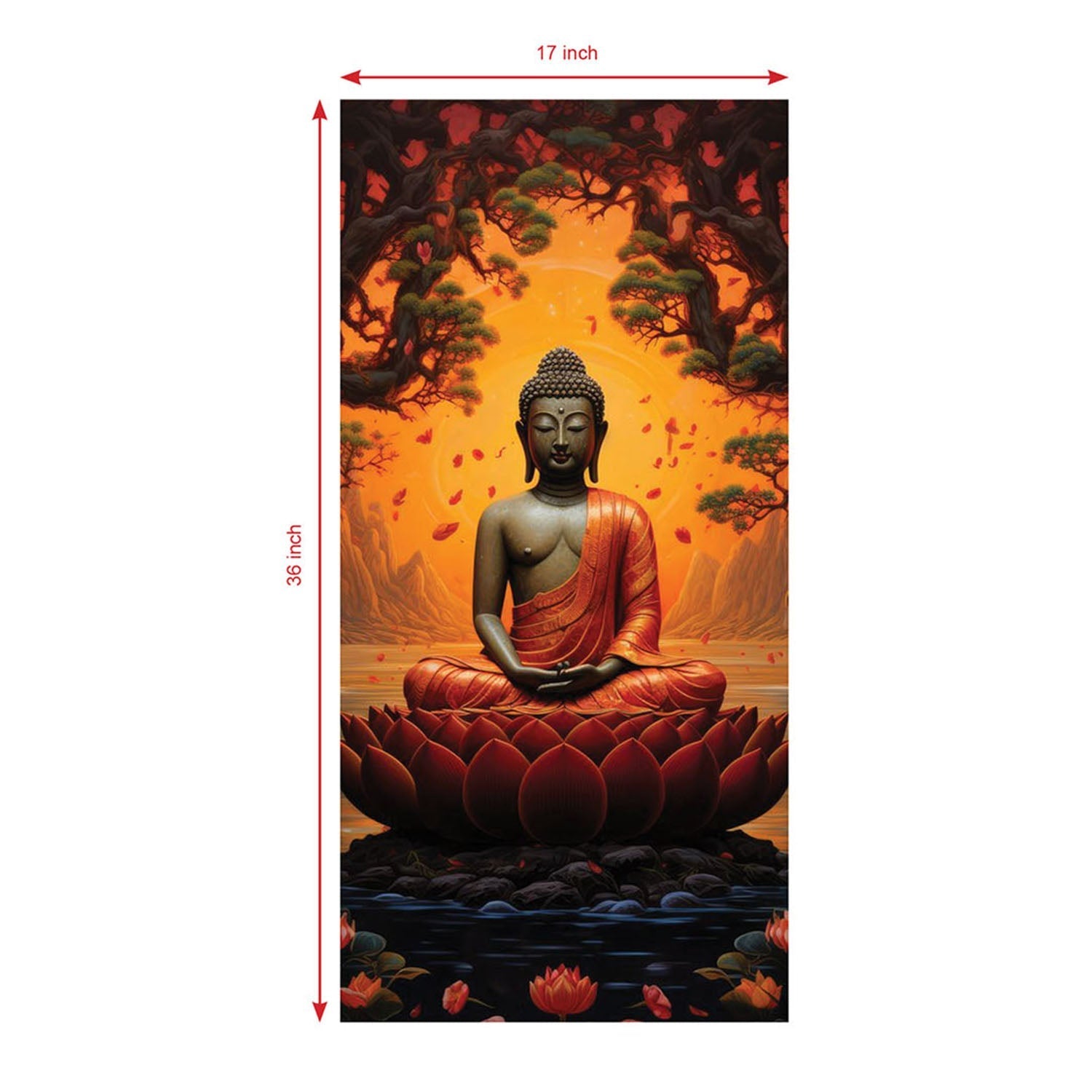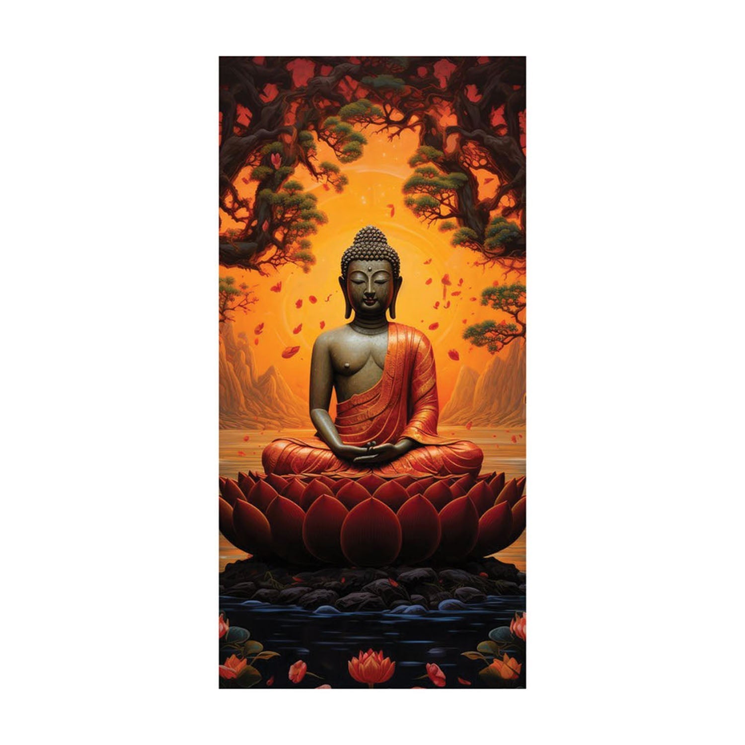 This Gautam Buddha artwork portrays a serene Buddha seated in deep meditation on a large lotus flower. The backdrop features a dramatic sunset with warm, fiery hues, while leaves gently fall around him, symbolizing peace amidst the chaos. The trees and mountains in the background frame the scene, adding to the sense of calm and contemplation. The image reflects inner tranquility, focusing on mindfulness and spiritual awakening.