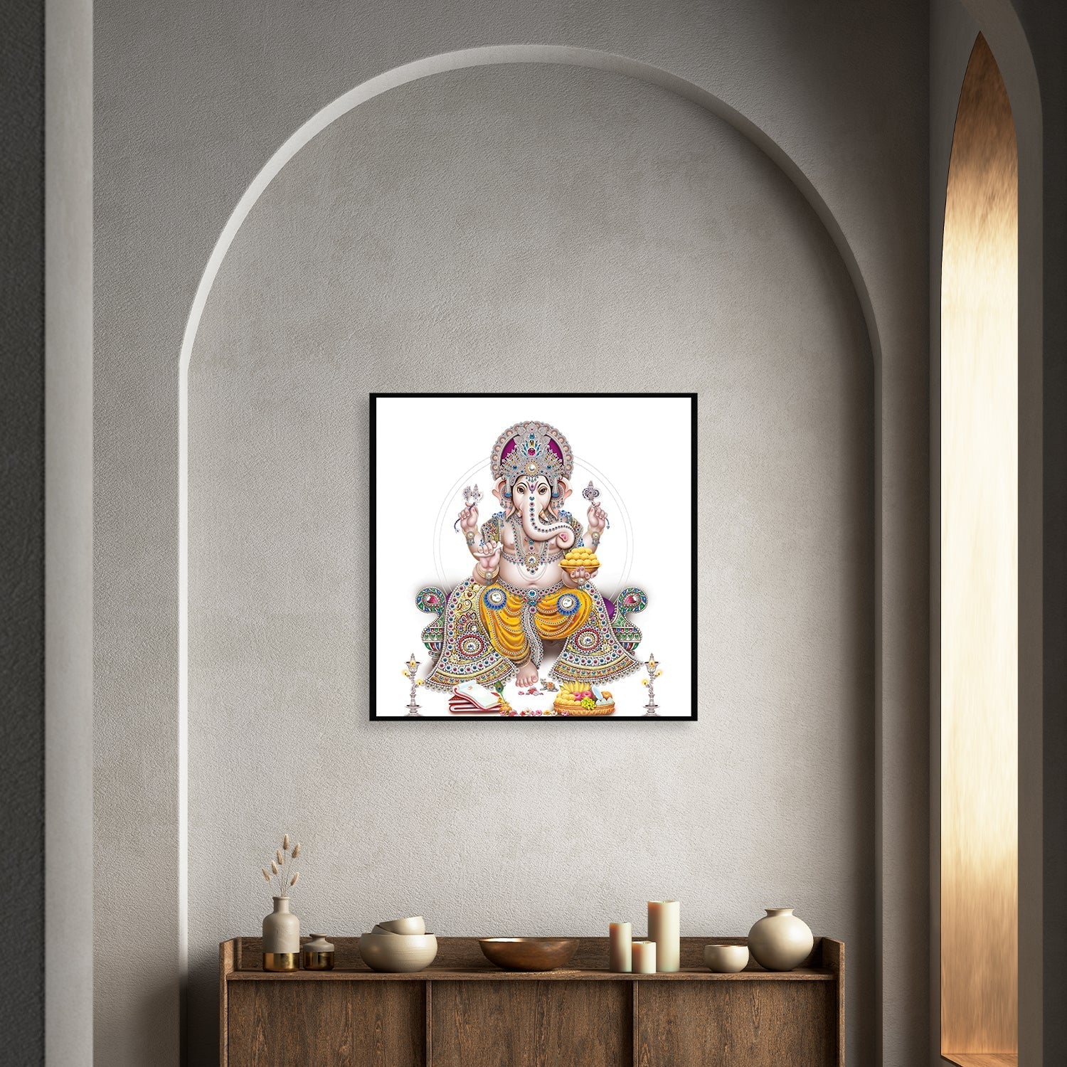 Bring a touch of serenity and Hinduism into your home with this beautiful canvas painting of Ganesha. His large ears and single tusk are prominent features, and he is adorned with colorful jewelry. This piece of art is sure to be a conversation starter and a cherished addition to your home decor.