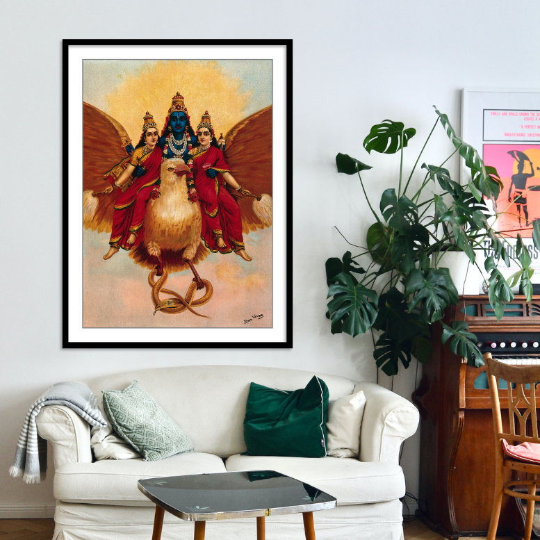 Vishnu accompanied by his wives riding on Garuda by Raja Ravi Varma Wall Art Painting